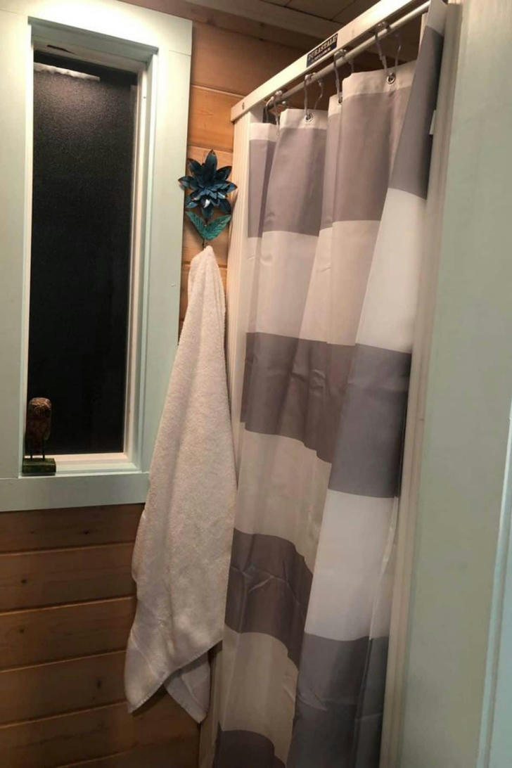 5. Gray And White Shower Curtain On Shower With Green And Wood Walls
