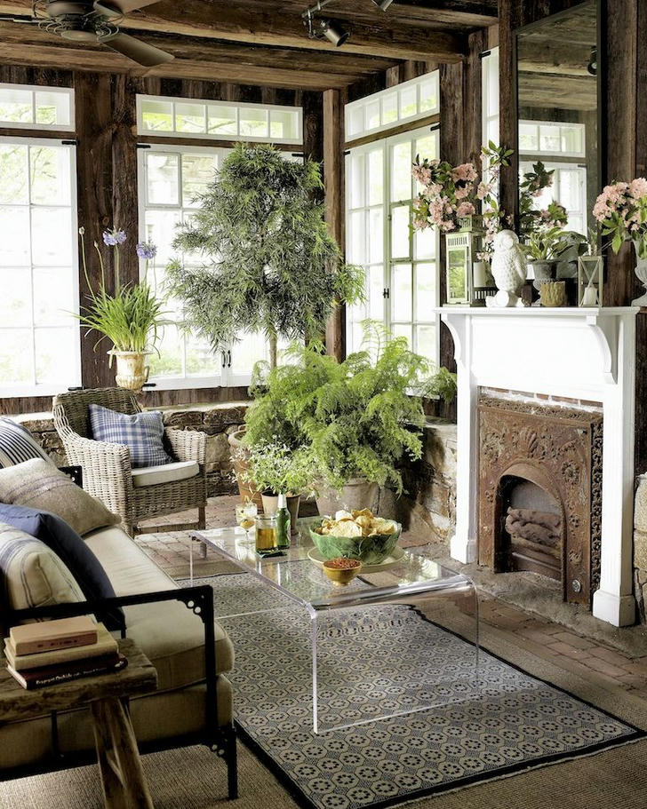 Surround yourself with aged natural materials and the result is pure rustic beauty. In this cozy window-wrapped sunroom, the reclaimed wood-planked ceiling and walls, an extended stone “baseboard,” and a brick floor set the rustic scene. An unexpected Lucite table and lots of lush plants add an outdoors-in vibe.