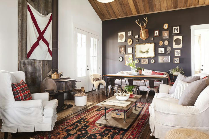 In this Tennessee cabin’s living room, a panel of salvaged corrugated metal provides the perfect backdrop for the vintage Orley woodstove and handmade flag, which sports the red cross of St. Patrick and adds a visual punch to the space. On another wall, matte gray-black paint is a sophisticated canvas for a casual gallery wall mix of framed and unframed family silhouettes, oil paintings, and a vintage deer mount.