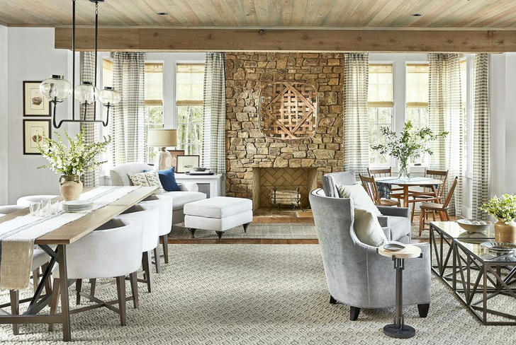 To create a rustic living room that feels sophisticated, keep things on the straight and narrow. In this ample living space that accommodates both seating and dining areas, the warm natural materials—and charming checked fabric—are there, but the furniture pieces all boast clean lines and tailored shapes for an elevated look.