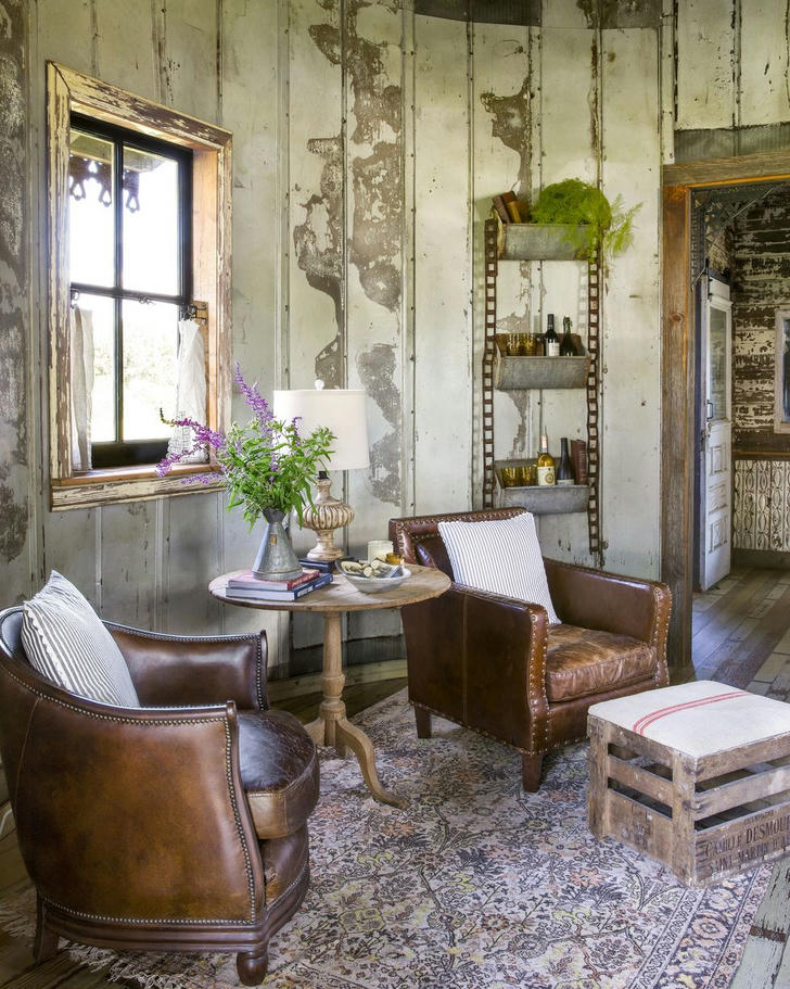 Chippy and peel-y architectural salvage brings a living room instant age and texture. After all, you can't spell “rustic” without a little “rust!” The living room of this grain silo-turned-guest house features numerous reuses of rustic salvage, including weathered sheet metal siding, chippy wood window frames, and even an old Champagne shipping crate that homeowner Amy Kleinwachter topped with a grain sack cushion to make into a footstool.