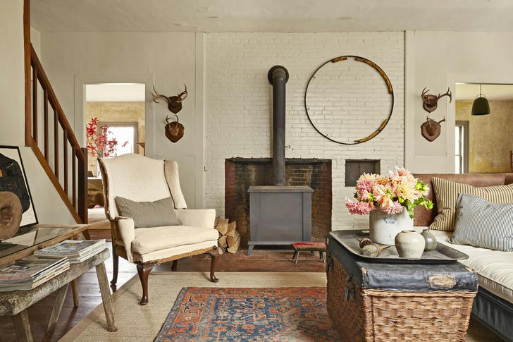 Rather than letting the existing red brick wall define the space, these homeowners chose to paint it a pretty creamy white. From there, they layered a new sisal rug with leather, wicker, wood, and linen to create a stylish and personal rustic space.