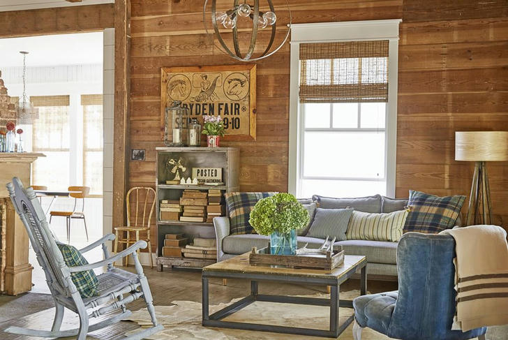Hold that paintbrush! Stain or simply seal wood shiplap walls to give a room a more rustic look and feel. In this farmhouse living room, the wood wall’s warm tones provide a cozy backdrop to furniture and pillows in a pretty color palette of varying grays and denim blues.