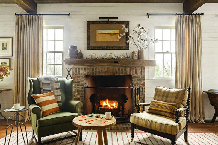 For the ultimate collected-over-time vibe, forgo matching furniture. Here, a wingback chair and a spool chair look right at home in this living room. Other period-appropriate decor found in this 100-year-old home: painted paneled walls, exposed ceiling beams, and a rustic mantel wood.