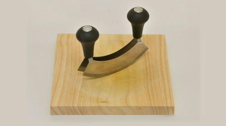 A vintage food chopper was a knife of sorts, but it was a curved half-moon shape that would allow the user to rock the tool back and forth over things like vegetables and herbs in order to cut them into small pieces.