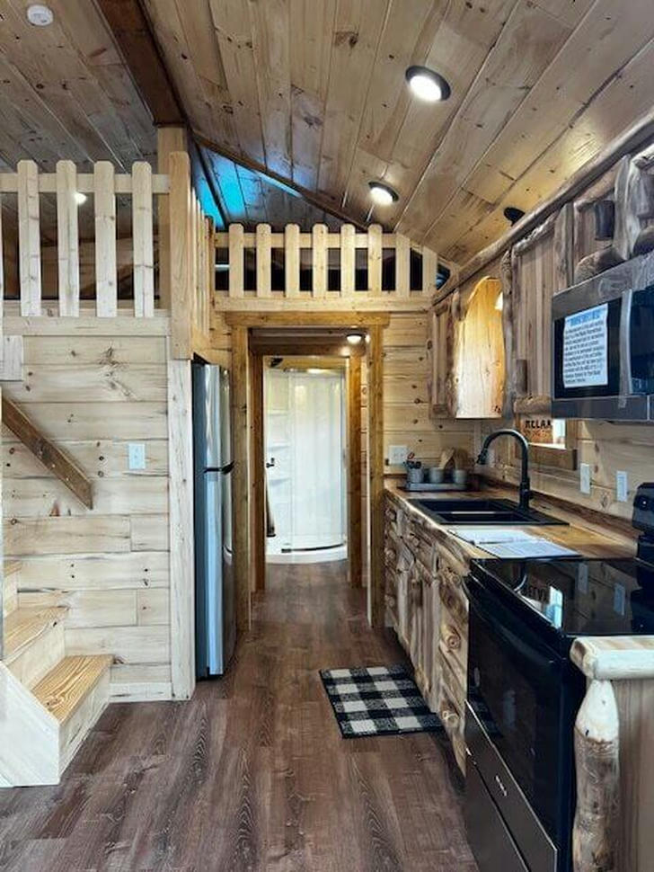 The kitchen flows seamlessly into a hallway that leads to a bright bathroom, complete with a modern shower. The stainless steel refrigerator is conveniently located next to the staircase, providing ample storage for groceries.