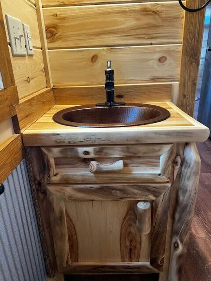 The bathroom's design maintains a consistent theme with the rest of the cabin. The cabinet's rustic handles, crafted from raw wood, stand out as a unique highlight, adding a touch of authenticity and craftsmanship to the space.