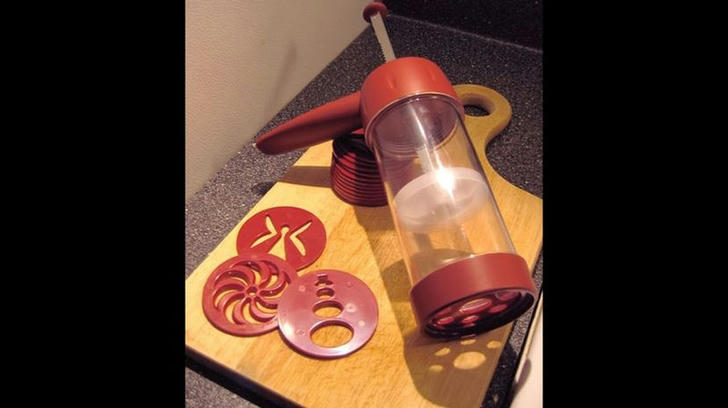 Correct Incorrect A cookie press is a contraption that you stuff cookie dough into and then pump the lever so that the cookie dough comes out the other end in whatever shape you've put at the bottom. They came with different disks that imprinted different shapes.