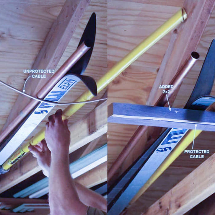 The suggested solution involves installing a 1-1/2-inch-thick board alongside the exposed plastic-sheathed cable. This board serves as protection and prevents accidental damage. The cable does not need to be stapled to the board. By providing this additional layer of safeguarding, the cable remains shielded from potential harm.