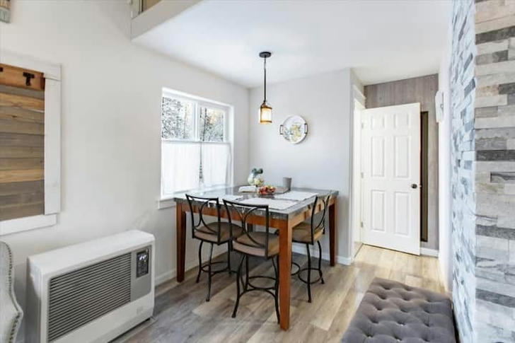Opposite the dining room is the kitchen. Despite its compact size, it's fully equipped with a refrigerator, oven, microwave, and even a coffee machine! The white cupboards keep the kitchen looking pristine, and a kitchen hood takes care of any grease, so you don’t have to worry about cleanup.